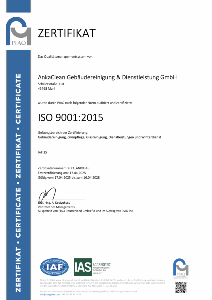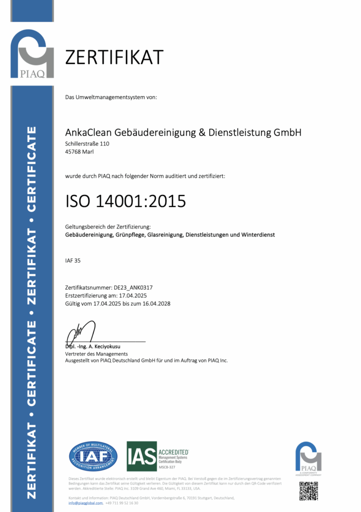 Die ANKACLEAN GmbH arbeitet nach internationalen Standards und ist zertifiziert nach: